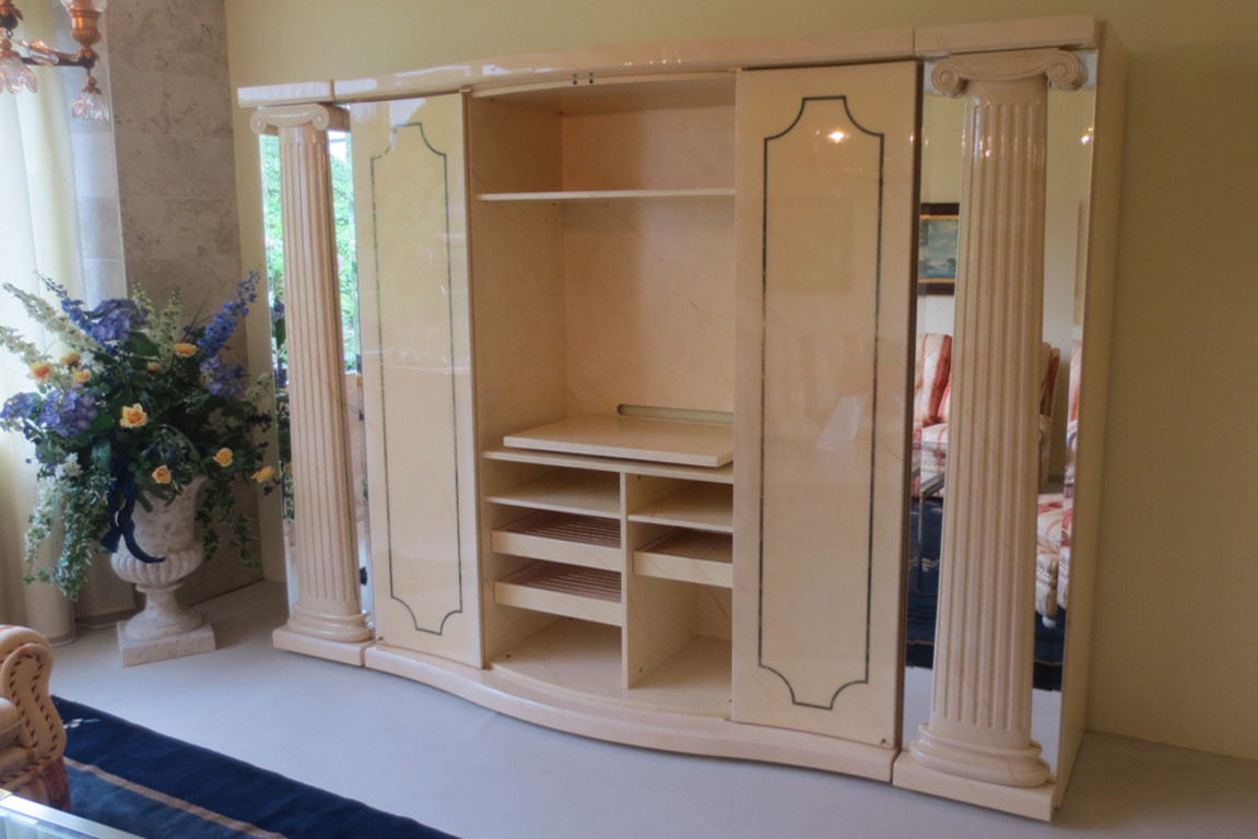 Diese außergewöhnliche Wohnwand ist geschaffen für repräsentative und elegante Räume. Inspiriert durch die Antike geben die Säulen mit ionischen Kapitelen der Schrankwand einen klassischen Charakter. Die Profile und Kannelierungen der Säulen sind nicht aufgemalt, sondern wurden aus dem Holz heraus gearbeitet. Sie wirken somit plastisch und natürlich. Ihre Wirkung wird durch die dahinter befindlichen Spiegel wirkungsvoll verstärkt.