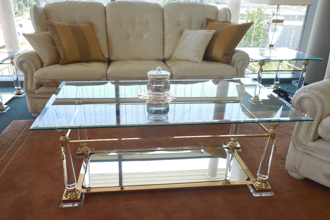 Dieser detailverliebte Couchtisch ist die harmonische Ergänzung für jede klassisch-elegante Garnitur. Die Tischplatte ist aus Glas mit Facettschliff. Die Tischfüße aus Acryl verziert mit vergoldeten Pinienzapfen stehen für einen außergewöhnlichen Geschmack.